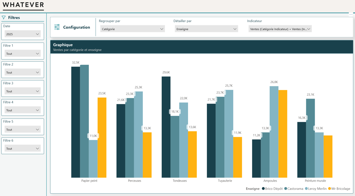 Nos rapports sont construits sur Power BI, un logiciel développé par Microsoft et leader sur le marché de la BI. Cela vous permet de disposer d'un grand nombre de ressources pour continuer à exploiter et faire évoluer votre rapport après l'intervention de Whatever.